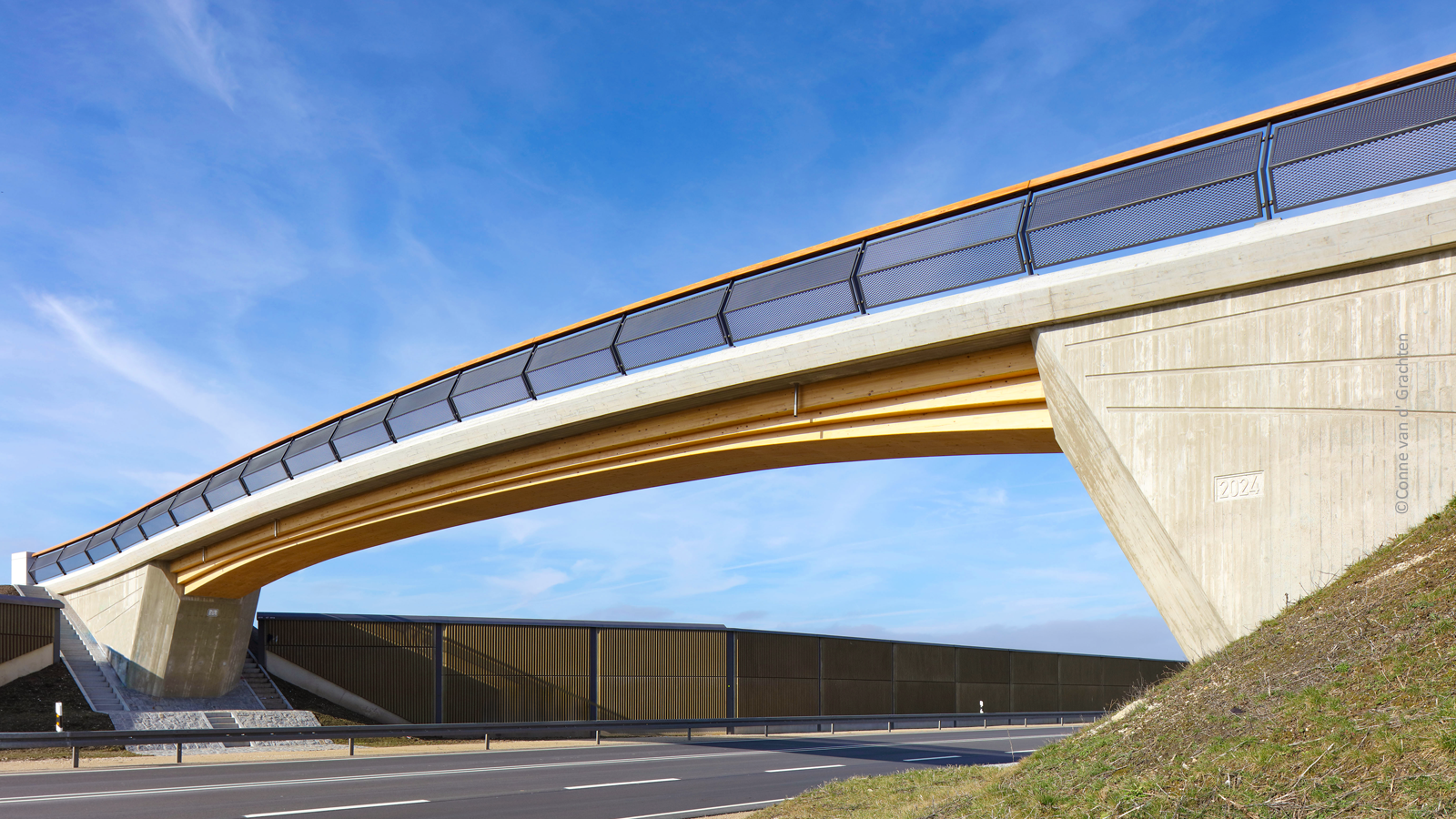 einfeldriger, integraler, einstegiger Plattenbalken in Holz-Betonverbund-Bauweise, Belag aus Gussasphalt, Geländer aus Flachstahlpfosten gefüllt mit Streckmetallgittern, Handlauf aus Stahl-C-Profil mit acetyliertem Abdeckprofil aus Brettschichtholz (Accoya)
