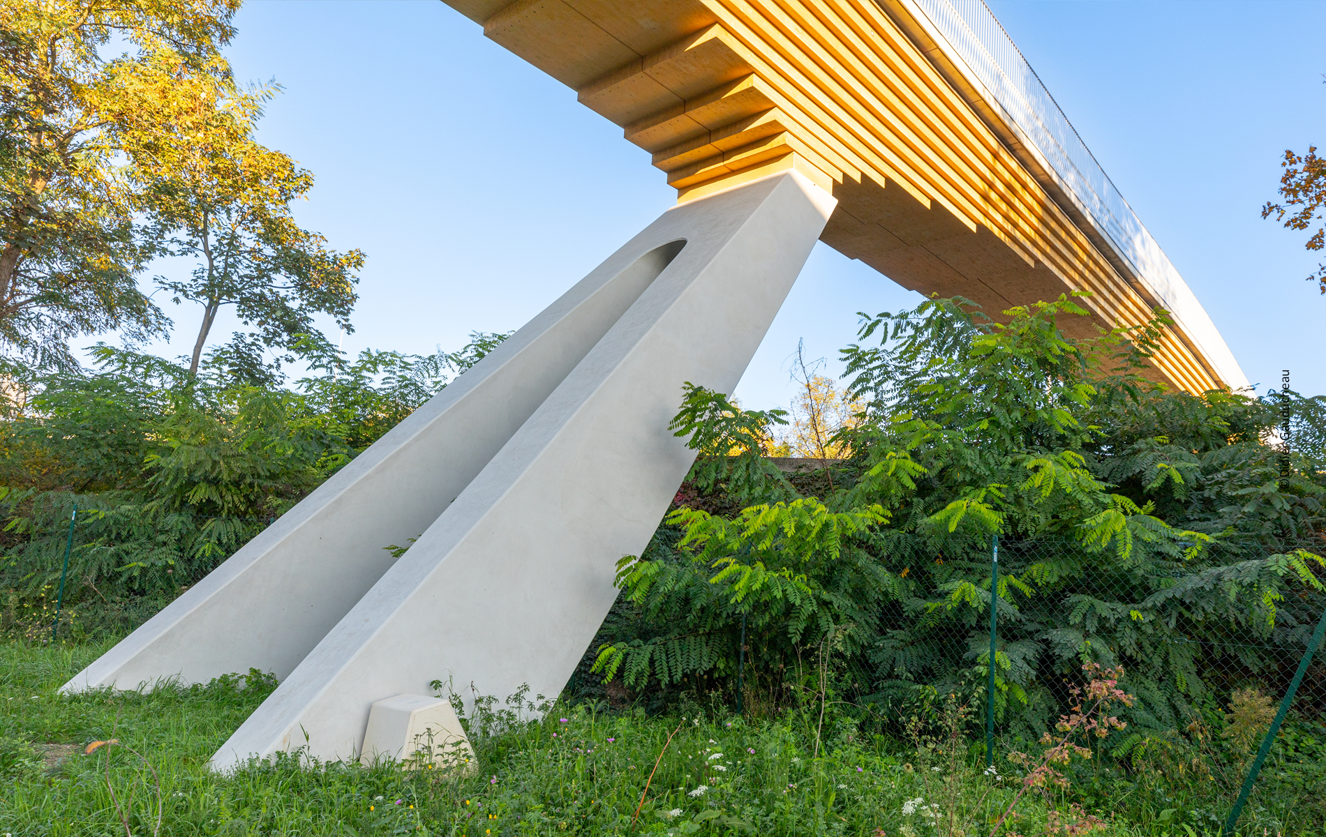Die Brücke, die über die französische Autobahn A1 eine Verbindung zwischen dem Mediendorf und dem Sportkomplex in Le Bourget schaffen wird, basiert auf einer einfachen und wirtschaftlichen Konstruktion, die dauerhaft und – aufgrund des durchdachten konstruktiven Holzschutzes – wartungsarm ist. Spezielle Anforderungen bestehen hinsichtlich des Brandschutzes: der Brückenbau muss 2 Stunden Feuerwiderstand leisten.